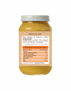 El potito Babybio Verduras y Jamón está elaborado con ingredientes 100% ecológicos, sin sal añadida ni conservantes. Combina verduras suaves como patata, zanahoria y guisantes, con jamón cocido de calidad, para ofrecer una comida equilibrada, nutritiva y con un sabor casero ideal para bebés desde los 6 meses. Su textura fina está especialmente pensada para facilitar la alimentación durante la transición a los sólidos.