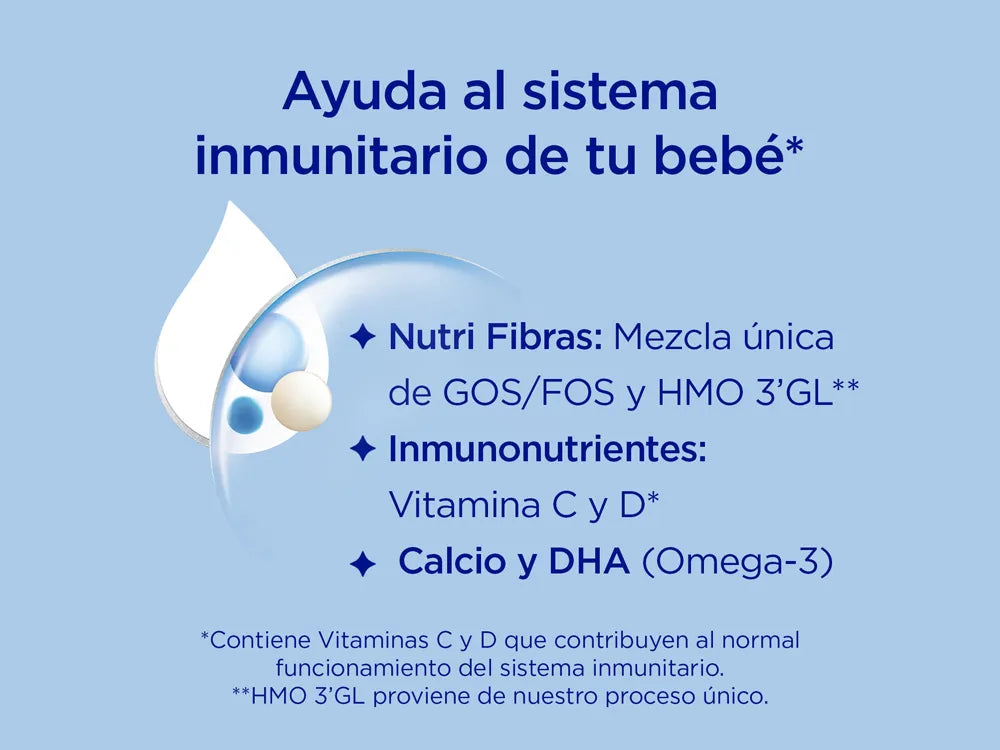 Lactosa (procedente de la leche ), aceites vegetales (palma, coco, cánola, girasol, girasol alto oleico), leche desnatada, suero desmineralizado (procedente de la leche ), galacto-oligosacáridos (procedentes de la leche ), espesante (semilla de algarrobo), suero concentrado (procedente de la leche ), fosfato de calcio, aceite de pescado , proteína de suero (procedente de la leche ), fructo-oligosacáridos, aceite de Mortierella alpina, cloruro de colina, citrato de potasio, citrato de sodio , cloruro de potasio, ácido Lascórbico, cloruro de magnesio, emulsificante (lecitina de soja ), inositol, taurina, carbonato de calcio, sulfato de hierro, L-Triptófano, sulfato de zinc, L-ascorbato de sodio, L-Carnitina, acetato DL-α-tocoferol, sal sódica de uridina 5′-monofosfato, citidina 5′- monofosfato, antioxidante (palmitato de ascorbilo), adenosina 5′-monofosfato, Dpantotenato de calcio, sal sódica de inosina 5′-monofosfato, nicotinamida, sal sódica de guanosina 5′-monofosfato, sulfato de cobre, DL-α-tocoferol, palmitato de retinol, hidrocloruro de tiamina, hidrocloruro de piridoxina, riboflavina, ácido fólico, yoduro de potasio, sulfato de manganeso, selenito de sodio, fitomenadiona, colecalciferol, DBiotina, cianocobalamina.