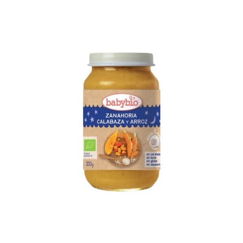 Menu noche Zanahoria, Calabaza y Arroz es un tarrito ecológico pensado para la cena de bebés a partir de los 6 meses. Su receta combina zanahoria, calabaza y arroz para ofrecer una comida ligera que favorece la saciedad y puede ayudar a que el bebé duerma de forma más tranquila.