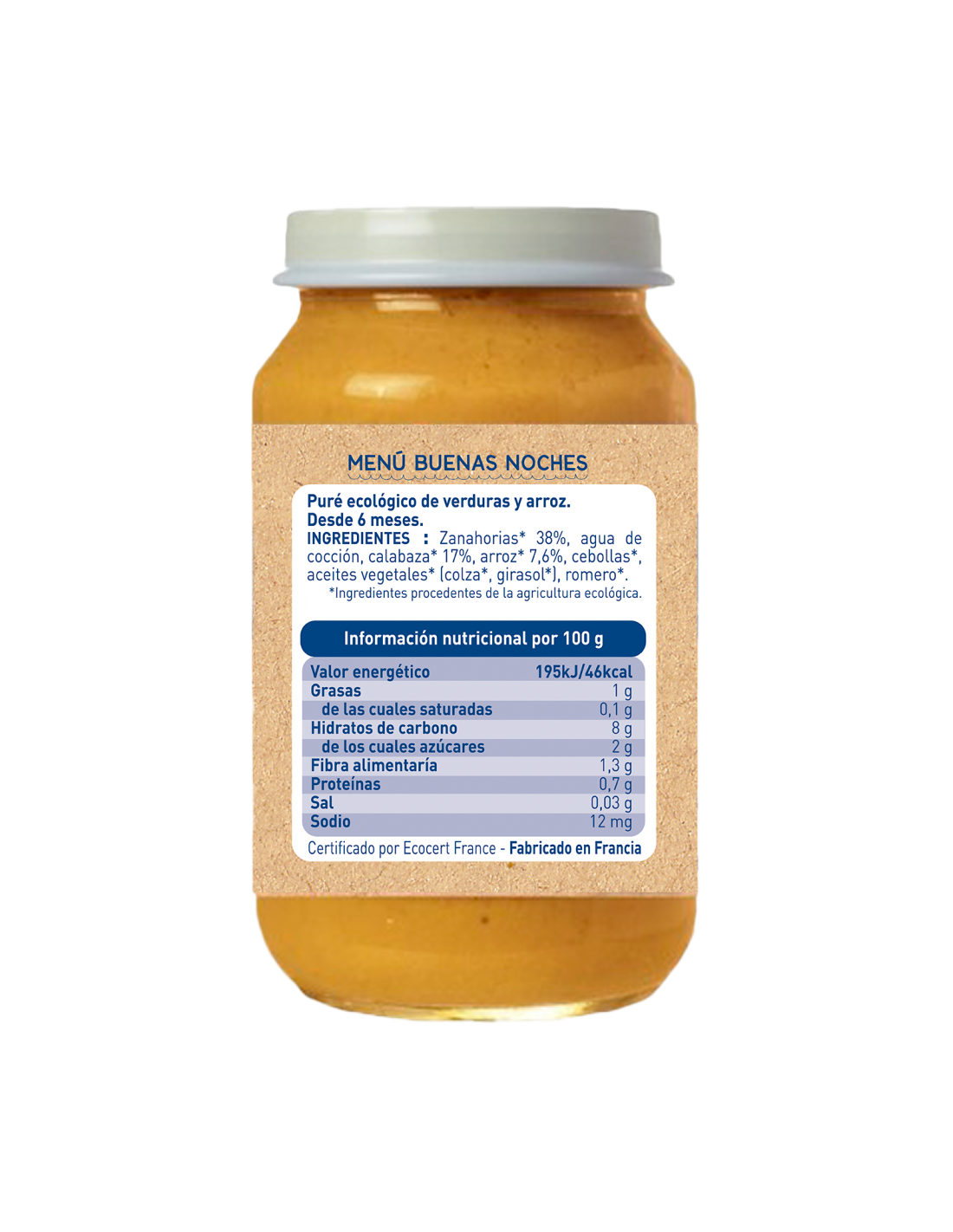 Ingredientes principales: zanahoria*, calabaza*, cebolla*, arroz*, agua de cocción, aceites vegetales* (colza*, girasol*), romero*. *Ingredientes procedentes de agricultura ecológica.
