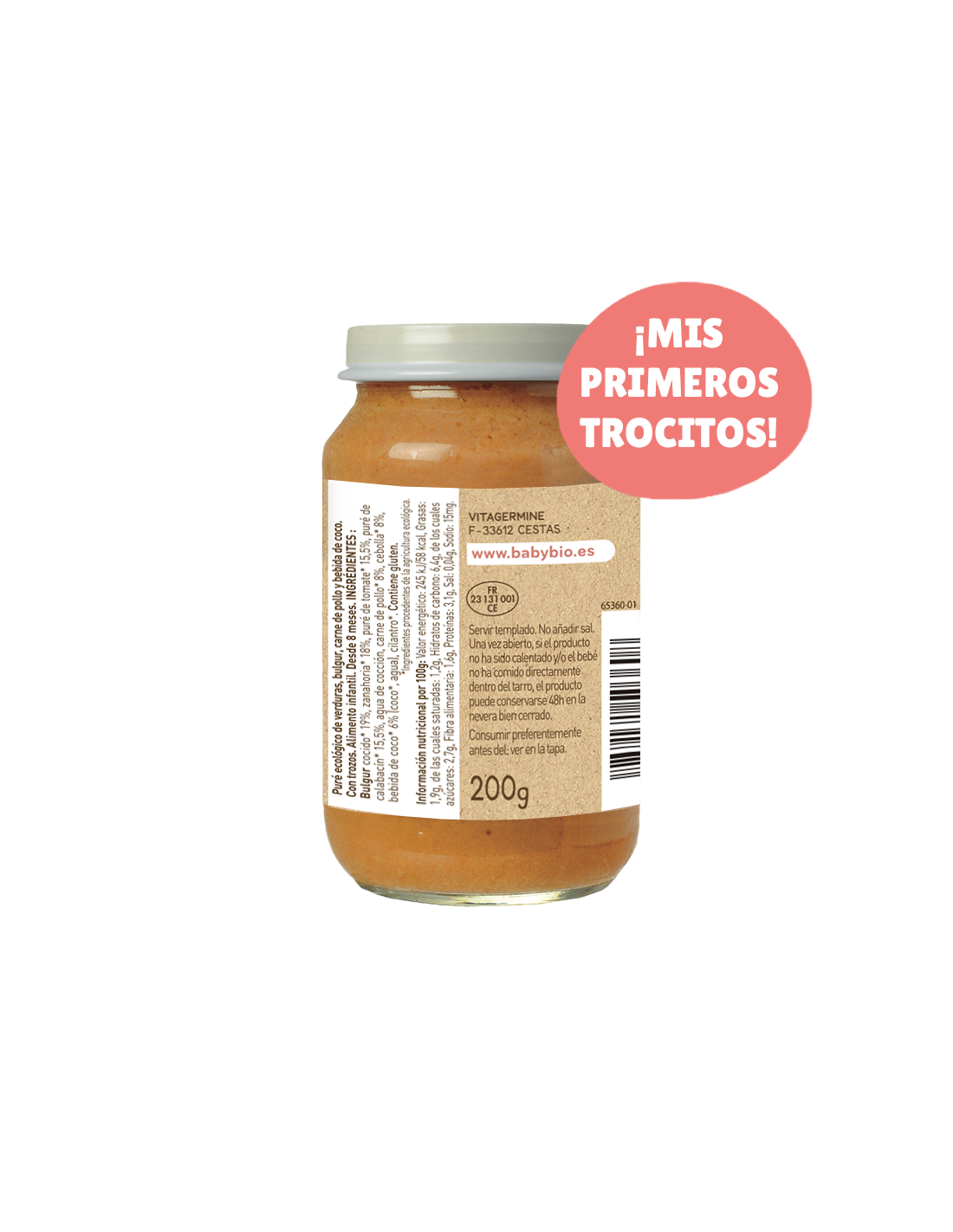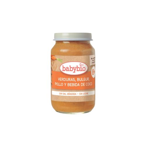 Ingredientes principales: verduras* (como zanahoria, calabacín, guisantes), bulgur* (trigo integral), pollo* (crianza ecológica), bebida de coco*, agua. *Procedente de agricultura ecológica.