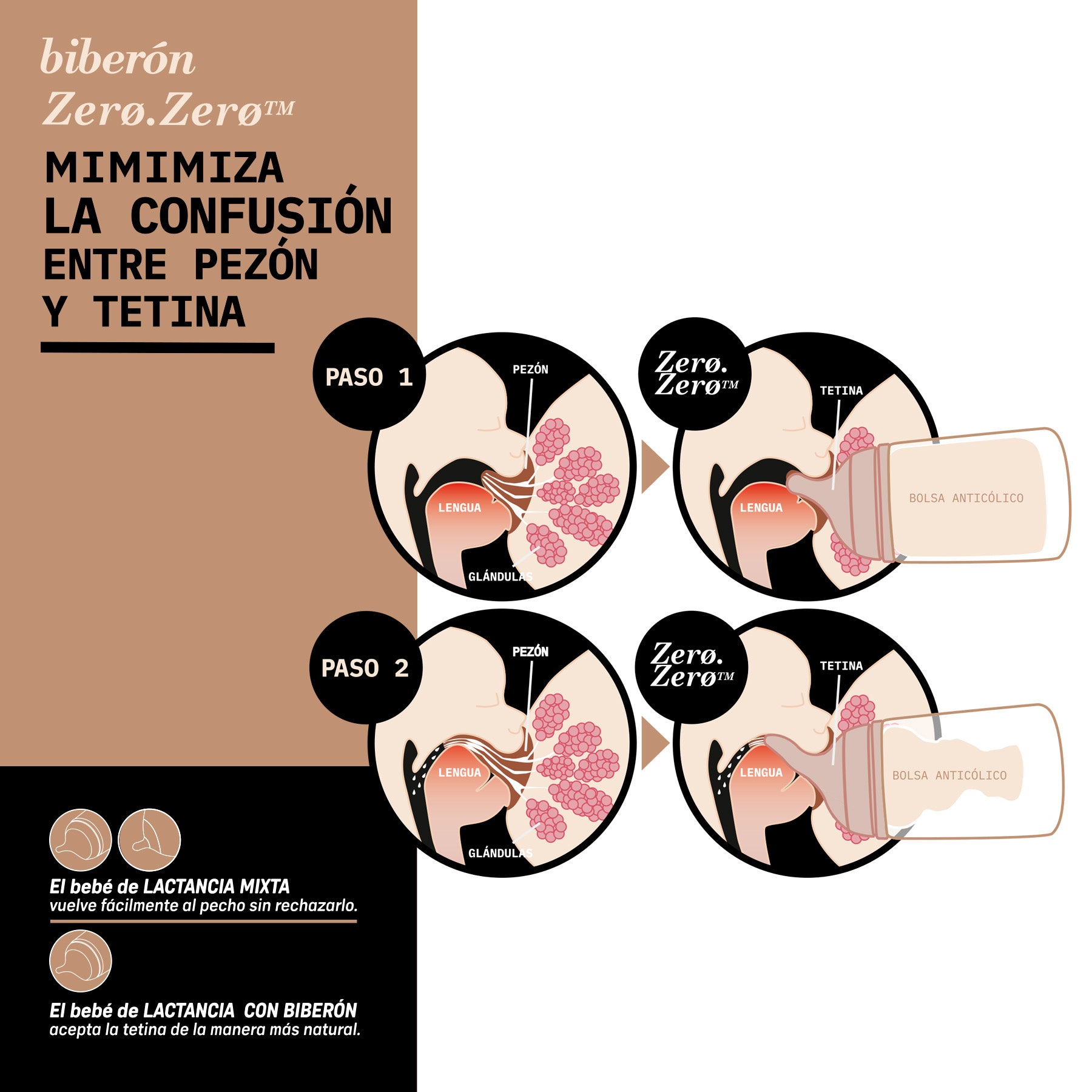 Doble innovación: tetina Zero.Zero con forma anatómica e inclinada + bolsa interna anticólicos que se contrae al ritmo de succión del bebé, imitando el comportamiento del pecho materno.