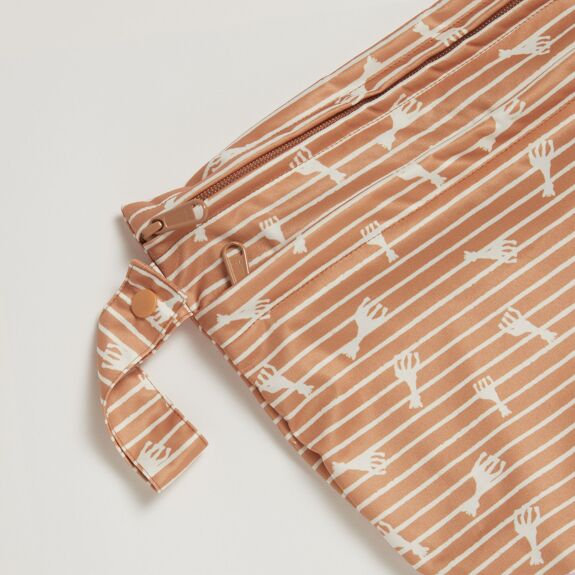 El bolso impermeable con estampado exclusivo Sophie La Girafe es un accesorio imprescindible para familias que usan pañales de tela o buscan una opción práctica para guardar ropa húmeda, bañadores o mudas sucias. Fabricado con materiales resistentes al agua y fácil de limpiar, cuenta con cremallera segura y asa con broche para colgar del carrito. Su diseño compacto y su estampado vegetal lo convierten en una opción funcional y bonita para el día a día.