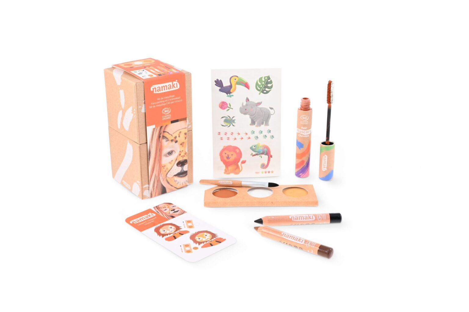 El Kit Maquillaje Tigre y Zorro de Namaki es un set infantil de maquillaje facial pensado para que los niños puedan convertirse en tigres o zorros durante fiestas, carnavales o juegos creativos. Incluye una paleta de colores básicos para realizar diseños animales de forma segura y divertida.