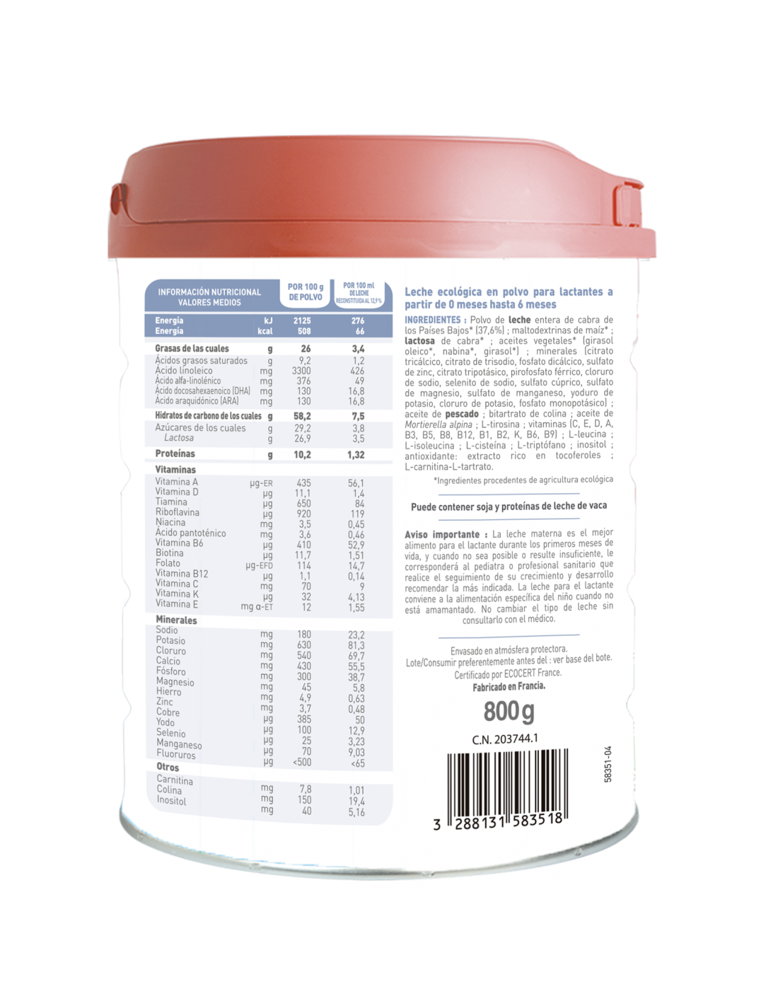 Polvo de leche entera de cabra de los Países Bajos* (36,5%); maltodextrinas de maíz*; lactosa de cabra*; aceites vegetales* (colza*, girasol*, girasol oléico*); aceite de pescado (proteínas de leche); minerales (carbonato cálcico, fosfato dipotásico, cloruro de magnesio, hidróxido cálcico, cloruro de sodio, hidróxido de potasio, sulfato ferroso, sulfato de cinc, selenito de sodio, sulfato cúprico, sulfato de manganeso, yoduro de potasio; bitartrato de colina; aceite de Mortierella alpina vitaminas (L-ascorbato sódico, nicotinamida, D-pantotenato cálcico, colecalciferol, acetato de retinilo, D-biotina, fitomenadiona, mononitrato de tiamina, clorhidrato de piridoxina, ácido fólico, acetato de D-alfa tocoferilo, DL-alfa tocoferol, 6-palmitato de L-ascorbilo, cianocobalamina, riboflavina);
