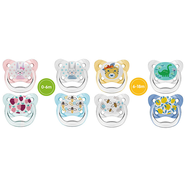 Se puede esterilizar y lavar en el lavavajillas (rejilla superior). Se recomienda esterilización eléctrica y agua hirviendo (no más de 5 minutos). No se recomienda esterilizar los chupetes en el microondas.