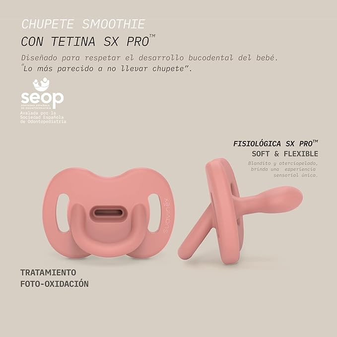 El chupete Suavinex Smoothie SX Pro está fabricado en una sola pieza de silicona médica, ideal para recién nacidos. Su tetina fisiológica y simétrica SX Pro respeta la posición natural de la lengua y favorece un desarrollo bucodental saludable. Es suave, flexible y ultraligero, perfecto para uso diario sin dejar marcas.