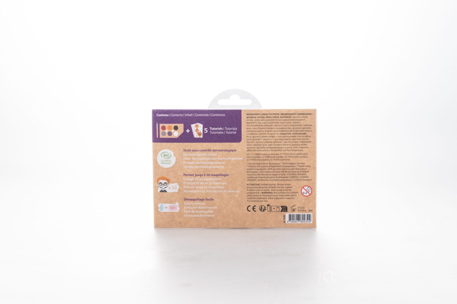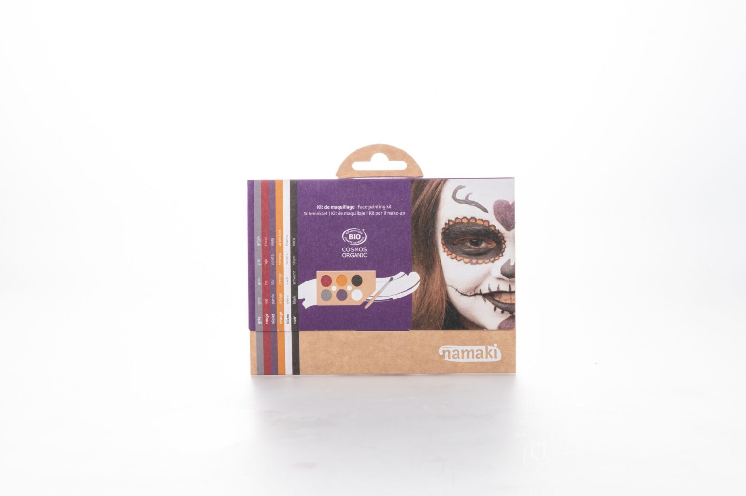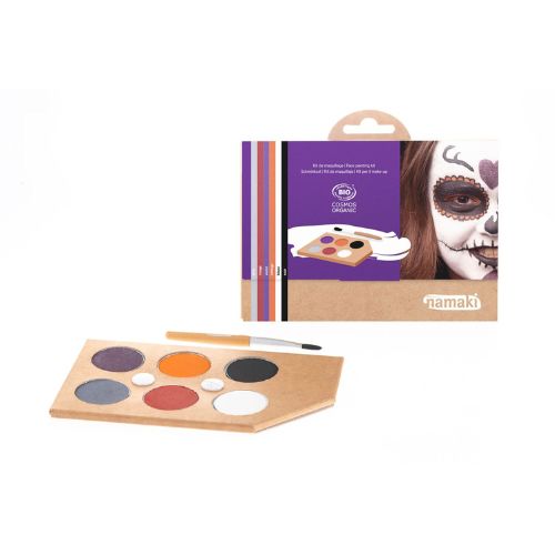 El Namaki Kit Maquillaje Mundo de los Horrores es un set infantil de maquillaje a base de agua, pensado para que los niños se disfracen y diviertan creando looks de vampiro, calabaza, monstruo, zombi, bruja, esqueleto, y más. Está certificado organicamente, con fórmulas hipoalergénicas y probadas para uso en piel de niños.