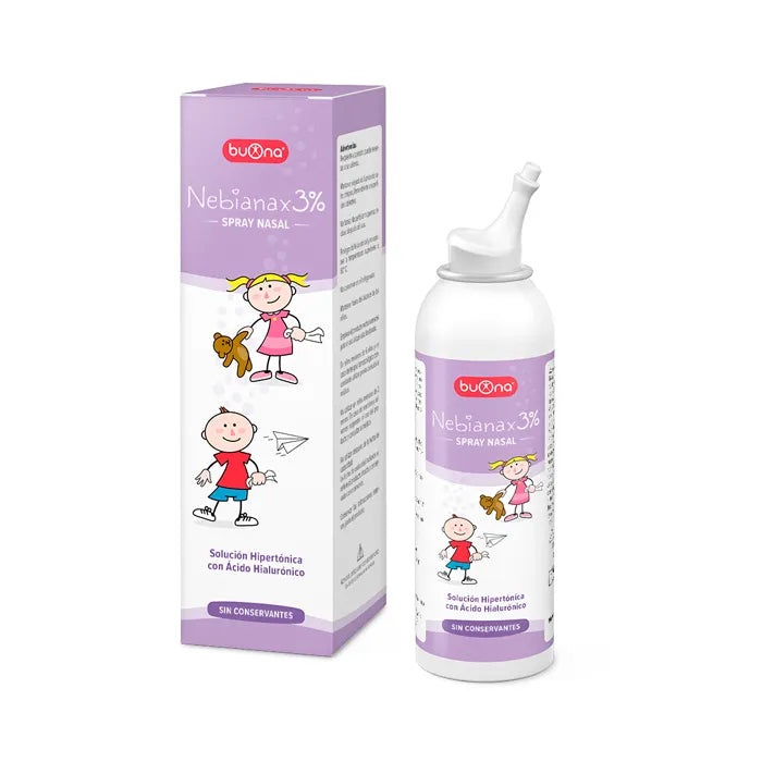 Buona nebianax 3% es un spray nasal que combina una solución salina hipertónica al 3% con ácido hialurónico , proporcionando una solución eficaz para aliviar la congestión nasal y mejorar la respiración.