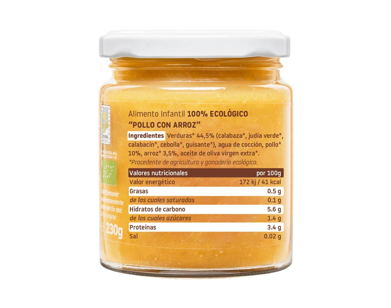 Verduras* [61,4 %: calabaza*, judía verde*, calabacín*, cebolla*], agua de cocción, pollo* (10 %), guisantes*, arroz* (5 %) y aceite de oliva virgen extra*. *Ingredientes de agricultura y ganadería ecológica.