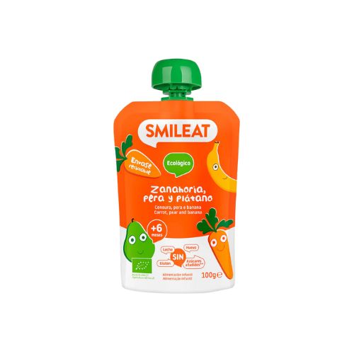 El Smileat Pouch de zanahoria, pera y plátano es un snack‑bolsita ecológico en formato práctico de 100 g, pensado para bebés a partir de 6 meses. Combina puré de frutas y hortaliza de cultivo ecológico para ofrecer una opción saludable, cómoda de llevar y fácil de usar fuera de casa.