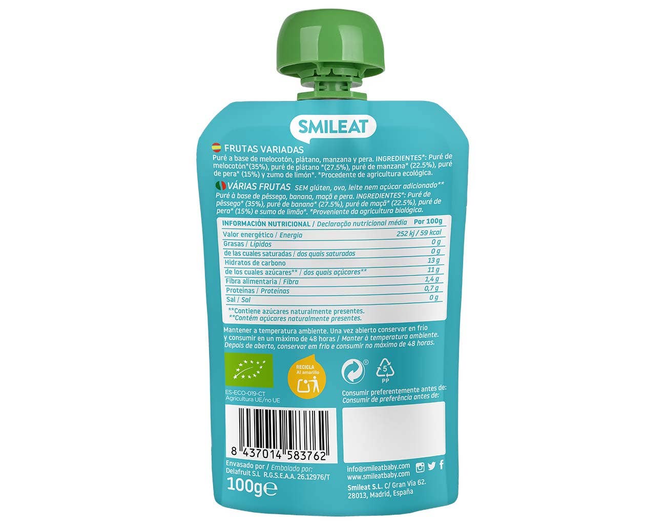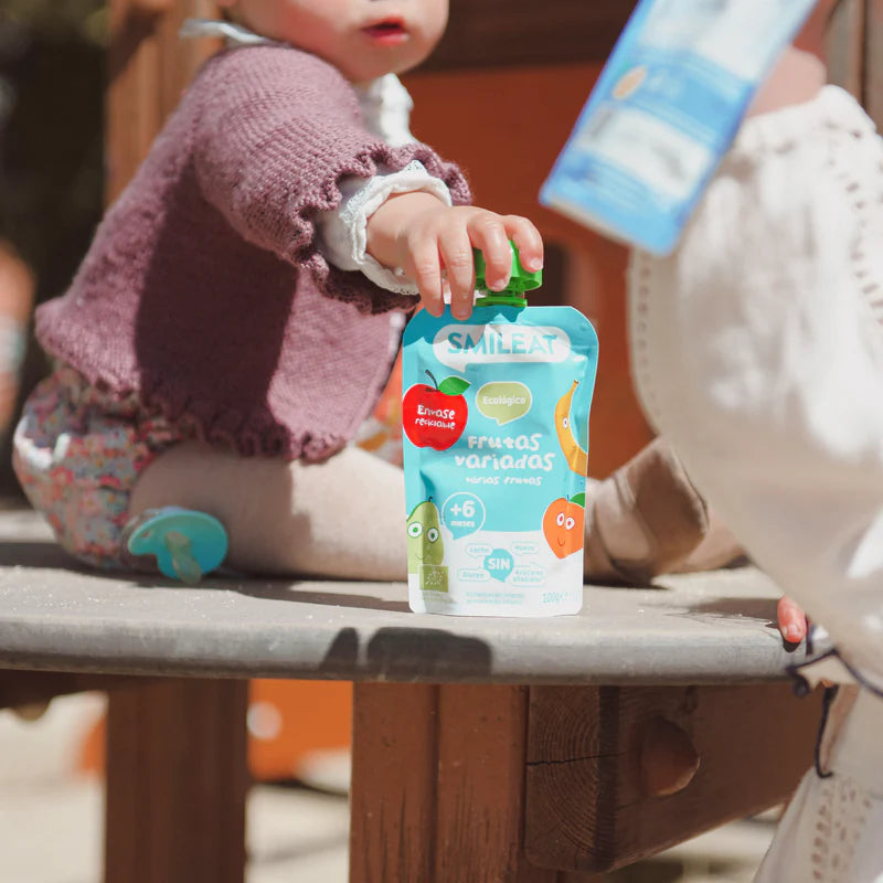 El Smileat Pouch Fruta Variada Ecológico 100 g es una combinación de melocotón, plátano, manzana y pera 100% ecológicos, pensado para bebés desde los 6 meses como merienda saludable. Combina puré de melocotón, plátano, manzana y pera, en un formato práctico y cómodo para llevar.