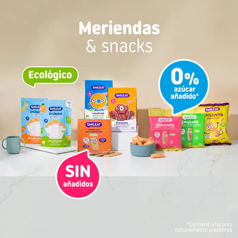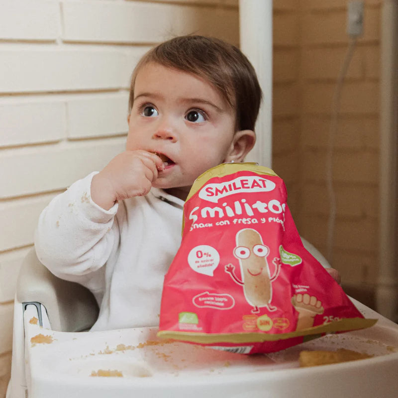 Los Smileat Smilitos de Fresa y Plátano son un snack horneado ecológico para niños, diseñado en forma de “gusano” para facilitar que los más pequeños lo sujeten y disfruten. Su textura ligera y su sabor frutal los hacen una merienda práctica, saludable y divertida.