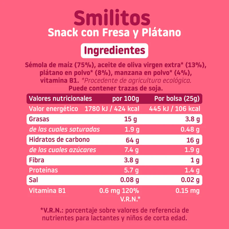 Contienen sémola de maíz* (≈ 75 %), aceite de oliva virgen extra* (≈ 13 %), plátano deshidratado* (≈ 8 %), fresa en polvo* y vitamina B1. (≈ 4 %). (*) Ingredientes procedentes de agricultura ecológica.