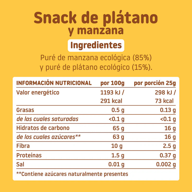 Puré de manzana (89,4%), puré de fresa (10%), aroma natural de fresa (0,6%). *Procedente de agricultura ecológica. Formato práctico de 25 g.