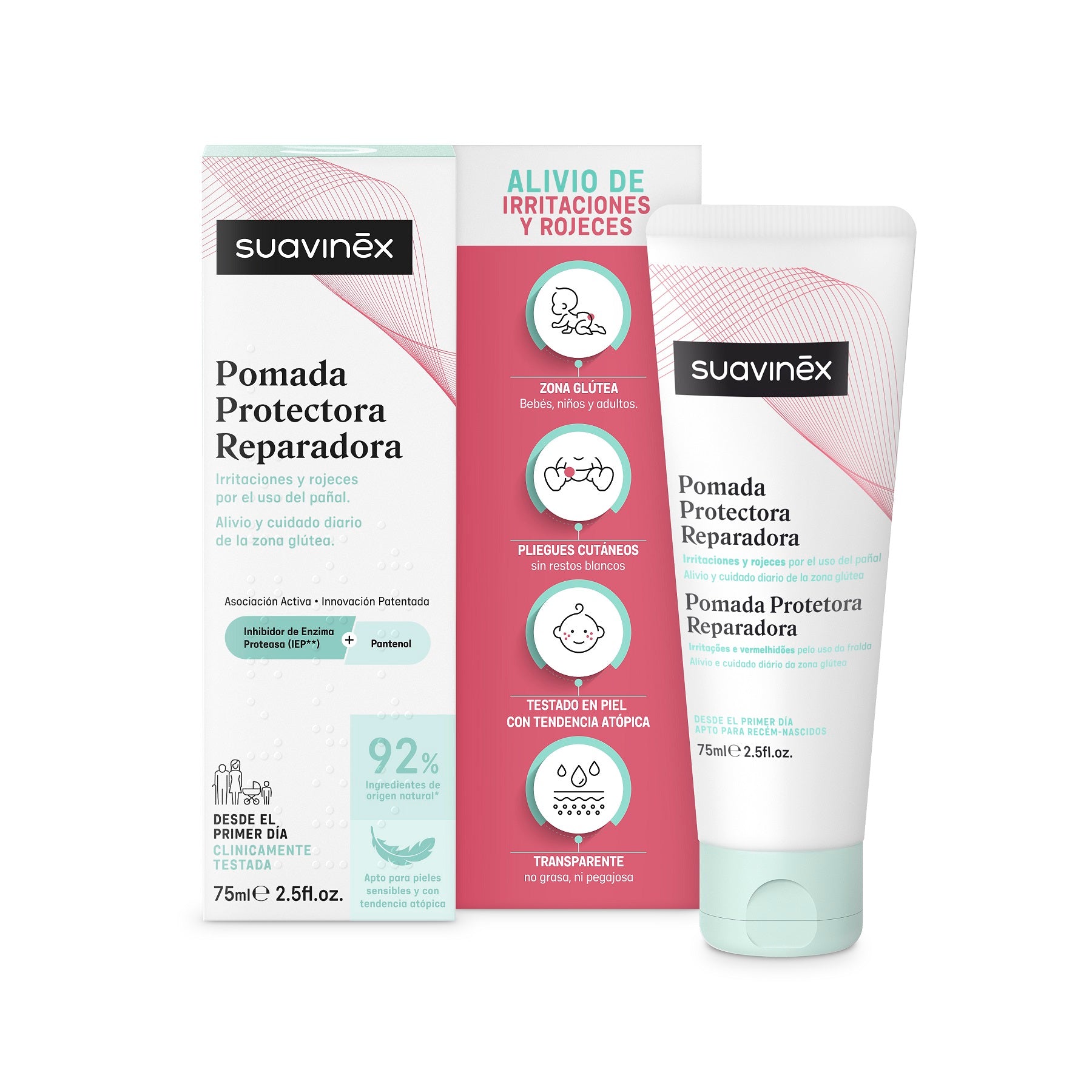 La Pomada Protectora Reparadora de Suavinex es una crema diseñada para tratar y prevenir la dermatitis del pañal. Con un 92% de ingredientes de origen natural, actúa desde la raíz para aliviar irritaciones y rojeces, ayudando a recuperar la piel fragilizada.