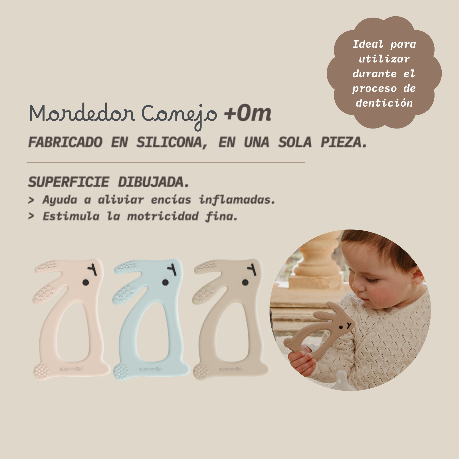 El mordedor conejito Wonderland de Suavinex está pensado para acompañar al bebé desde el nacimiento y ayudar a aliviar las molestias de la dentición. Su diseño ligero, de tamaño reducido y fácil agarre permite que el bebé lo manipule con comodidad cuando empieza a llevarse todo a la boca.