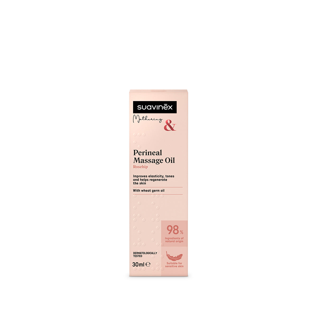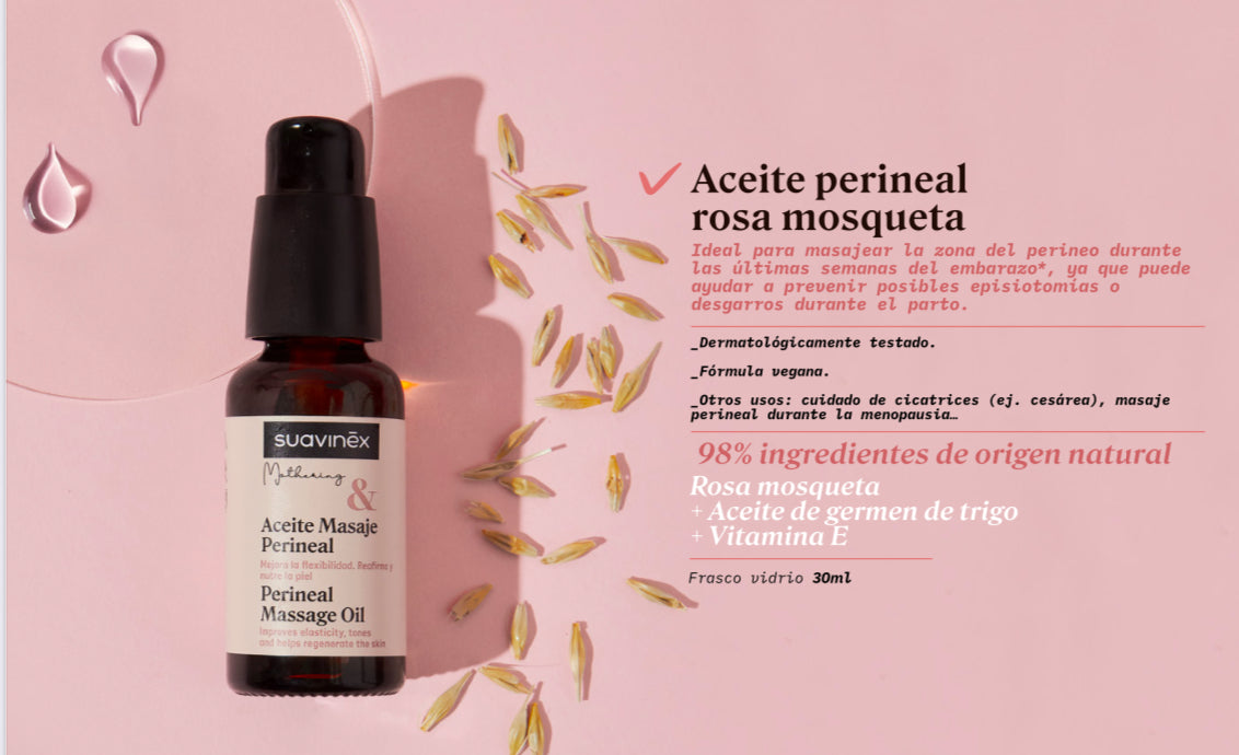 El Aceite de Masaje Perineal Suavinex, con rosa mosqueta y aceites vegetales 100 % naturales, mejora la elasticidad de la piel y prepara el periné para el parto de forma segura y respetuosa.