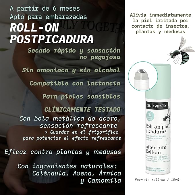 Roll-On postpicaduras para bebés +6 meses, embarazadas y madres lactantes. ¡Para toda la familia! Alivio inmediato del picor de mosquitos, medusas o plantas. Con ingredientes naturales. Sin alcohol y sin amoniaco. Clínicamente y dermatológicamente testado.