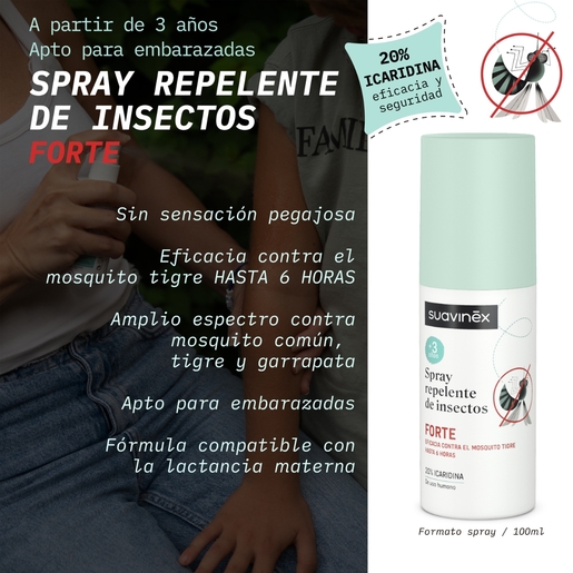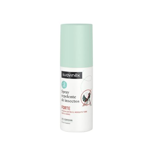 Suavinex Spray Repelente Antimosquitos Forte es un spray repelente desarrollado para ofrecer una protección eficaz y duradera contra las picaduras de mosquitos e insectos. Su fórmula está especialmente indicada para niños a partir de 3 años, adultos, embarazadas y madres lactantes, lo que lo convierte en una opción segura y versátil para toda la familia. Ideal para usar en zonas con presencia de mosquito tigre, mosquito común y garrapatas.