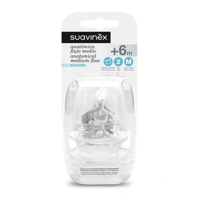 La tetina anatómica de silicona Suavinex está diseñada para imitar la forma del pezón materno durante la succión. Gracias a su diseño adaptado al paladar del bebé, ofrece una experiencia de alimentación natural y confortable, ideal desde el nacimiento.