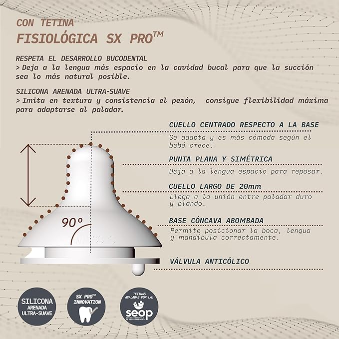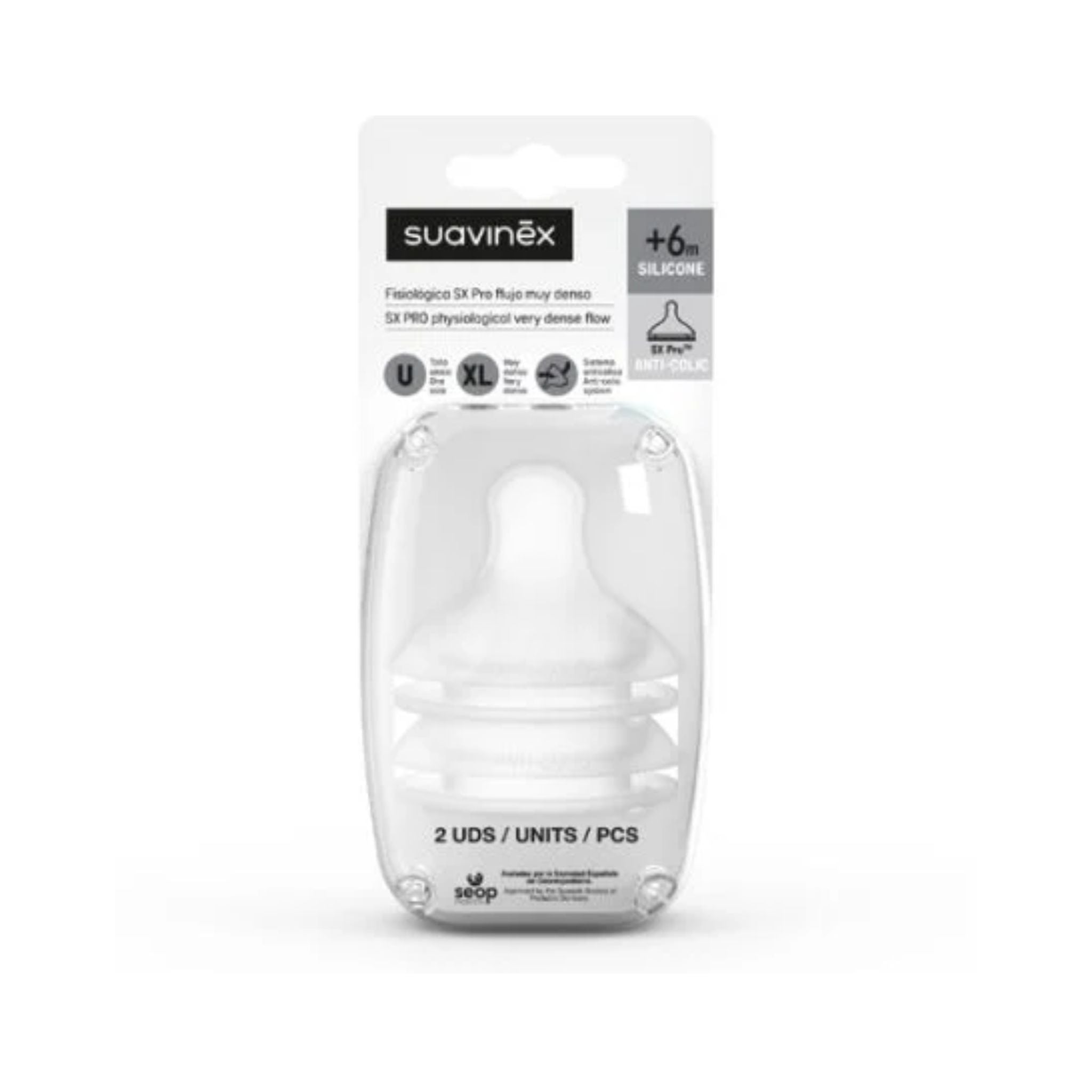 La tetina fisiológica SX PRO de Suavinex está diseñada para imitar la succión natural al pecho. Su forma plana, simétrica y ultra flexible permite que la lengua del bebé mantenga una posición fisiológica, favoreciendo un desarrollo bucodental saludable y una experiencia de alimentación más natural. Está avalada por profesionales de la odontopediatría.