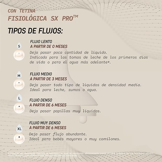 Flujo lento (+0 m): Deja pasar poca cantidad de líquido. Indicada para las tomas de leche de los primeros días de vida o para el agua más adelante