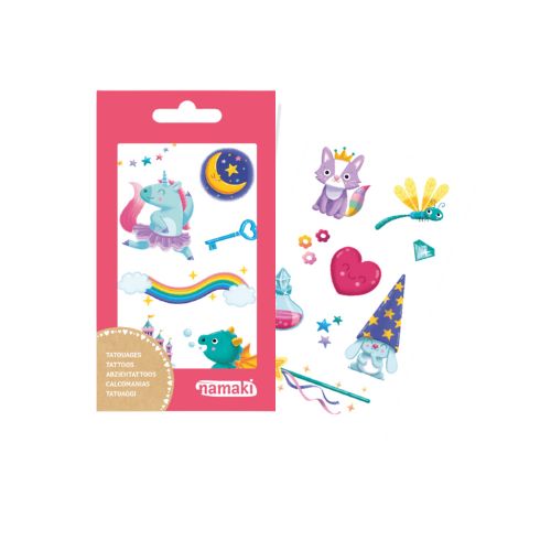 Tattoo Mundo Mágico de Namaki es un set de tatuajes infantiles temporales con motivos fantásticos: unicornos, estrellas, hadas, y otros elementos mágicos. Permite que los niños decoren su piel de forma divertida y creativa, ideal para fiestas temáticas, disfraces o simplemente para jugar.